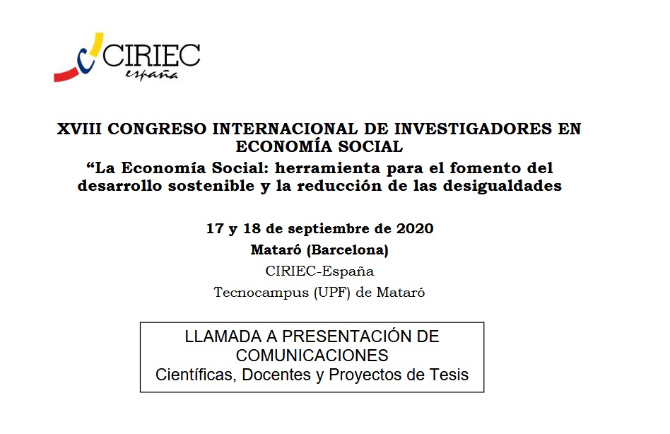 CIRIEC-Españak Ekonomia Sozialeko Ikertzaileen Nazioarteko XVIII. Biltzarrerako komunikazioak aurkezteko deia egin du. Biltzarra 2020ko irailaren 17an eta 18an izango da Mataró-Maresmeko Tecnocampus-ean, Pompeu Fabra Unibertsitateari atxikia (UPF). XVIII. Kongresuaren gai nagusia “Ekonomia soziala: garapen jasangarria sustatzeko eta desberdintasunak murrizteko tresna” da. Biltzarra CIRIEC-Espainiak antolatzen du, UPFko Ekonomia Sozialeko Katedraren, Fundació Roca Galèsen eta Xarxa d’Economia Solidàriaren (XES) laguntzarekin.