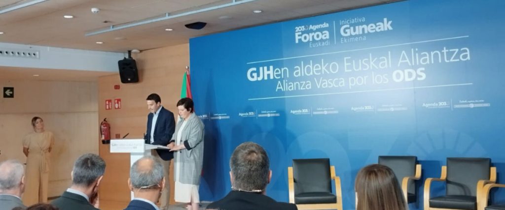 El pasado día 2 de octubre se constituyó en Vitoria-Gasteiz la Alianza Vasca por los ODS, acto que contó con la presencia del Lehendakari, Iñigo Urkullu, acompañado del Secretario General de Transición Social y Agenda 2030, Jonan Fernandez, así como del Consejero de Economía y Hacienda, Pedro Azpiazu; la Consejera de Salud, Gotzone Sagardui; y la Consejera de Igualdad, Justicia y Políticas Sociales, Nerea Melgosa. El evento contó también con una numerosa presencia de representantes de las entidades firmantes.