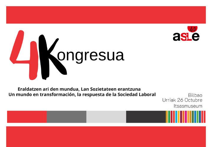 El próximo 26 de octubre tendrá lugar en Bilbao la celebración de 4Kongresua, el 4º Congreso de ASLE, bajo el lema “Un mundo en transformación, la respuesta de la Sociedad Laboral”.