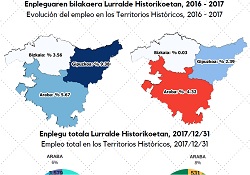 Por Territorios Históricos, es Gipuzkoa quien mayor subida ha tenido. Considerando las sociedades laborales limitadas y anónimas, ambas a la vez, el empleo ha conocido un aumento del 2,4% en dicho territorio, mientras que en Bizkaia se ha mantenido estable (aumento de menos del 1%) y en el Territorio Histórico de Araba, en cambio, ha disminuido levemente (un -0,8%).