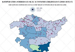 Atendiendo a la distribución entre los Territorios Históricos, ha sido en Bizkaia donde más cooperativas se han creado (más de la mitad, el 57%), seguido por Gipuzkoa (32%) y Araba (11%). Las comarcas donde se encuentran las capitales de los Territorios Históricos aglutinan el 67% del total de la creación de cooperativas, siendo el Gran Bilbao la más próspera en este sentido, por delante de Donostialdea y la Llanada Alavesa (44%, 14% y 9% respectivamente). Dejando de lado las capitales, seguiría un grupo formado por el Bajo Bidasoa y Duranguesado (cada una con 6%) y el Goierri (4,5%).