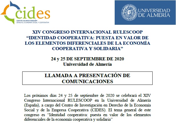 Los próximos días 24 y 25 de septiembre de 2020 se celebrará el XIV Congreso Internacional RULESCOOP en la Universidad de Almería, a cargo del Centro de Investigación en Derecho de la Economía Social y de la Empresa Cooperativa (CIDES). El tema general de este congreso es “Identidad cooperativa: puesta en valor de los elementos diferenciales de la economía cooperativa y solidaria”.