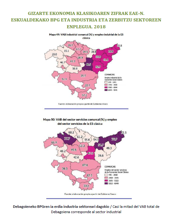 Tal y como se aprecia en el segundo mapa, el sector servicios tiene una importancia relativa grande prácticamente en todas las comarcas, sobre todo en el caso de Bilbao, Bajo-Bidasoa o la Llanada Alavesa. Es por ello que dichos territorios  también aglutinan buena parte del empleo del mismo sector de la Economía Social Clásica.