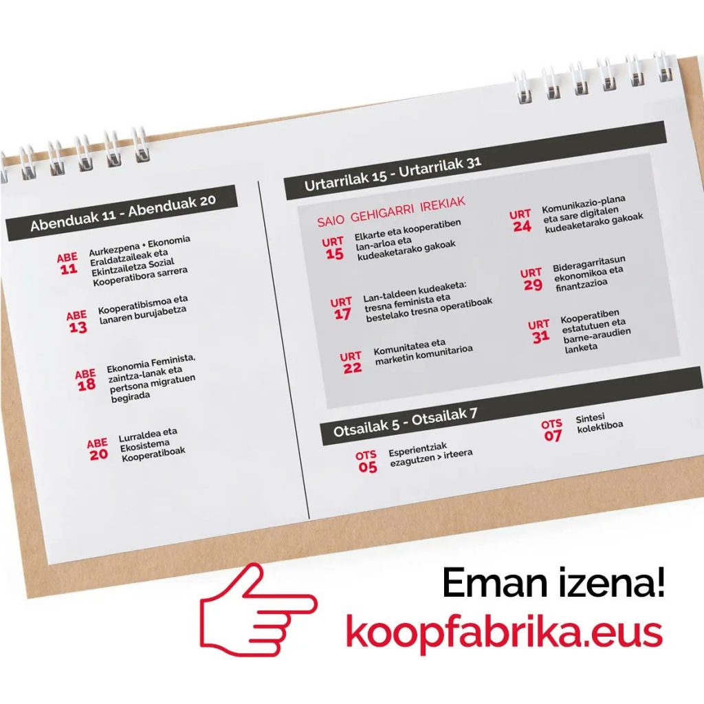 12 formazio-saiok (hauetako 6 saio gehigarri irekiak dira eta hautazkoa da bertan parte hartzea) eta bidelaguntza aldiak osatzen dute ekintzailetza kooperatiboko eskola.