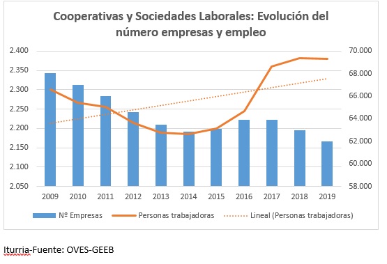 2009tik 2019ra, nabarmen jaitsi da enpresa kooperatiboen eta lan-sozietateen kopurua. Horrek ez du esan nahi enplegua murrizten denik. Aitzitik, enpresa horiek gero eta langile gehiago dituzte.