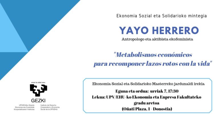 “Bizitzarekin hautsiriko loturak berrezartzeko metabolismo ekonomikoak” izenburupean, aktibista ekofeminista eta antropologoak hitzaldia emango du datorren urriaren 7an Donostiako UPV/EHU-ko Ekonomia eta Enpresa Fakultatean. Hitzaldia gazteleraz izango da, sarrera librekoa eta arratsaldeko 17:30etan hasiko da, Donostiako UPV/EHU-ko Ekonomia eta Enpresa Fakultateko Gradu Aretoan. Hitzaldia GEZKI-k (Gizarte Ekonomia eta Zuzenbide Kooperatiboaren Institutua) antolatzen duen Ekonomia Sozial eta … Irakurtzen jarraitu Yayo Herreroren hitzaldia urriaren 7an Donostian